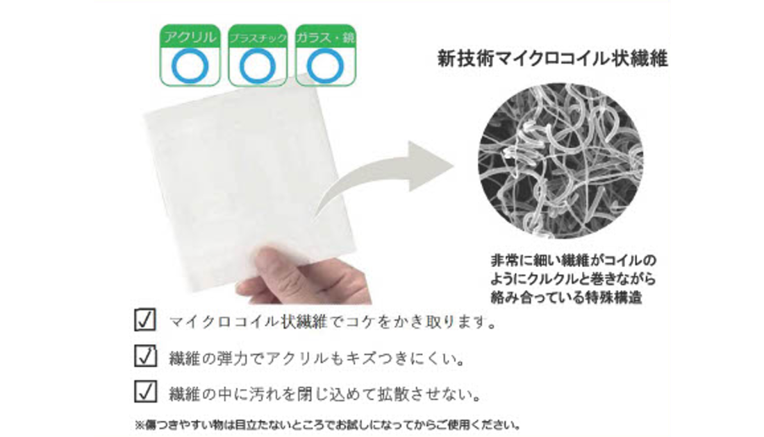 角の無い非常に細かい繊維が、コイルのようにくるくると巻きながら絡み合っている特殊構造ですので、吸い上げ効果により補足した汚れを戻しません。また埋まった汚れをかき取り、摩擦力で磨き効果を発揮。小キズ内のコケも少ない力で掻き取り、バネのような弾力性で表面への衝撃が和らぎキズを付けにくくします。